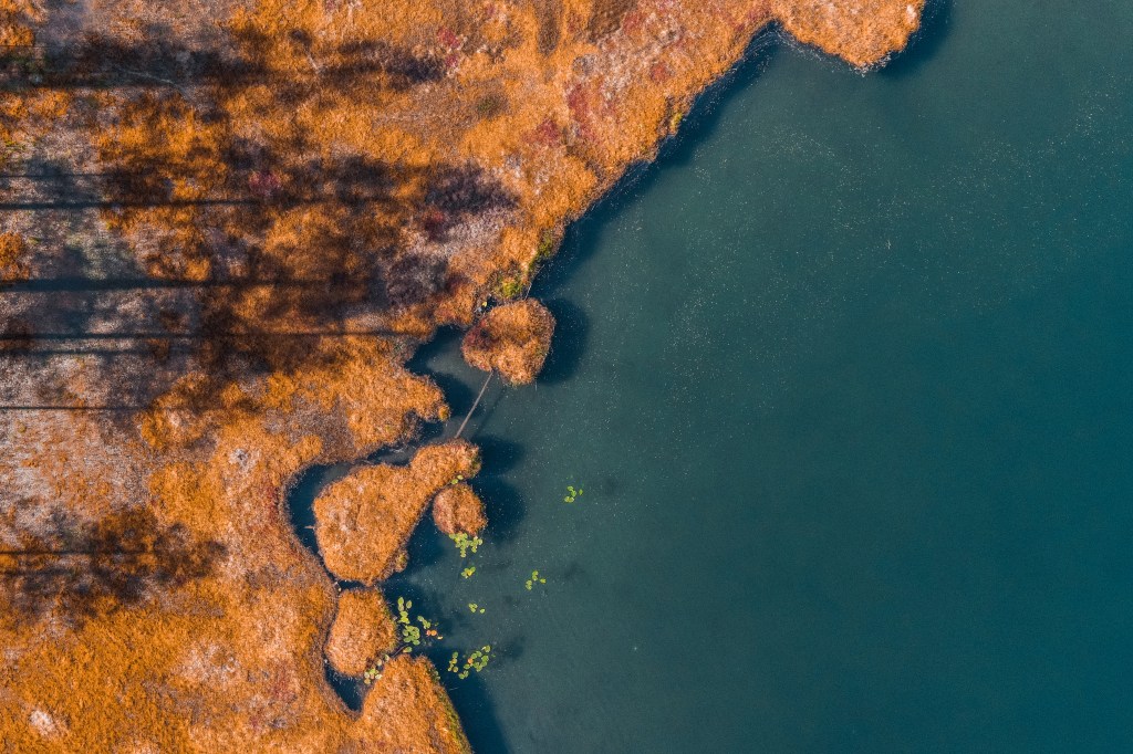 Viimeisessä kuvassa on dronella kuvattu suoraan ylhäältä päin kirkasvetinen järvi. Rannat on tommosta suomaista, mutta muuten kyseessä on kirkasvetinen järvi. Mäntyjen varjot lankeaa maaruskassa olevalle rannalle ja lisäksi järjessä vielä pari lummetta. Tämä on itselle merkityksellinen kuva siitä, että tämän kuvan ottamisen jälkeen pari tuntia eteenpäin selvisi, että ostotarjous on mennyt läpi omasta omakotitalosta. Kyseiseltä pihalta on kuvattu muun muassa näyttelyn Ilves taulut.”
