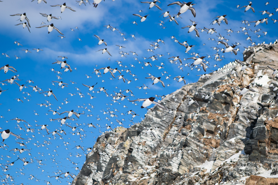 Seuraavassa kuvassa on paljon ruokkilintuja myös sieltä Koillis-Norjan puolelta Hornoyalta. Kuvan keskellä on ruokki ja muuten enemmistö on etelänkiislaa ja tarkka silmä sieltä voi myös löytää lunnin.