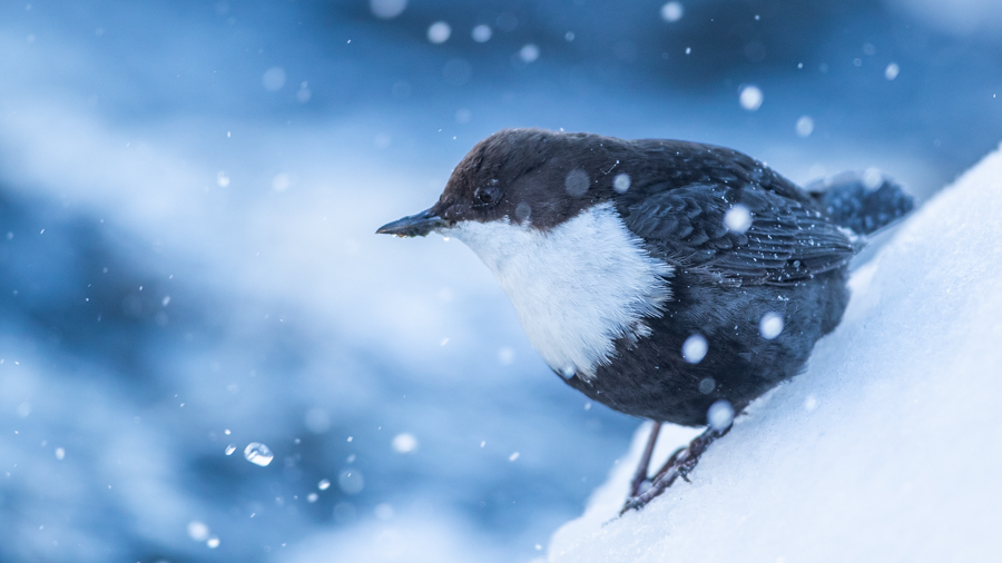 Koskikara on yksi suosikkilinnuistani, mutta myös tämä kuva on ehdottomasti omia suosikkejani. Tässä on monta elementtiä kohdillaan. Kaltevat lumiset kalliorinteet heijastivat pehmeää valoa, kova pakkanen, höyhenpeitteeseen huurtuneita jääkiteitä, nokassa jäätynyttä jälkeä ruokailusta, tuulenpuuska pölläytti pakkaslunta, kosken kuohut sekä roiskuvat vesipisarat.