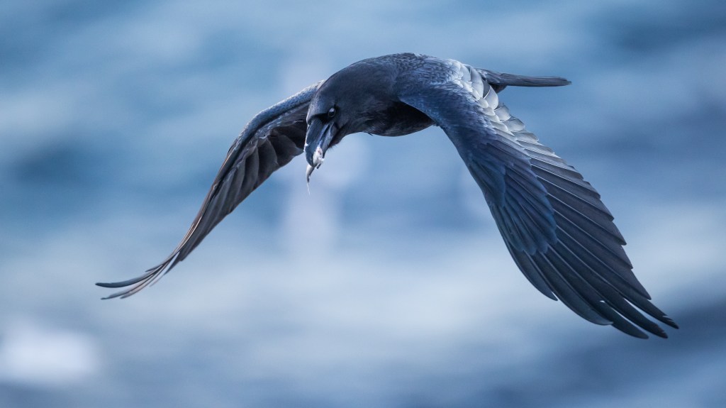 Seuraavassa kuvassa on tosiaan korppi kuvattuna samalta paikalta. Siinä on suomalaisille tuttu musta korppi, mutta oikeassa valossa hyvin nähtynä näkee ettei kyseessä olekaan ihan musta lintu sekään. Kuvaan oikea valo on saatu kaltevien lumisten rinteiden heijastavan valon avulla. Rinteestä sain heijastumaan valoa myös siipien yläpinnoille, jonka avulla tämä kaikki metallinhohtoisuus tuli näkyviin. Nokassa korpilla on kala. Hornoyalla korpit varastavatkin usein kiislojen tai lunnien tuomia kaloja.
